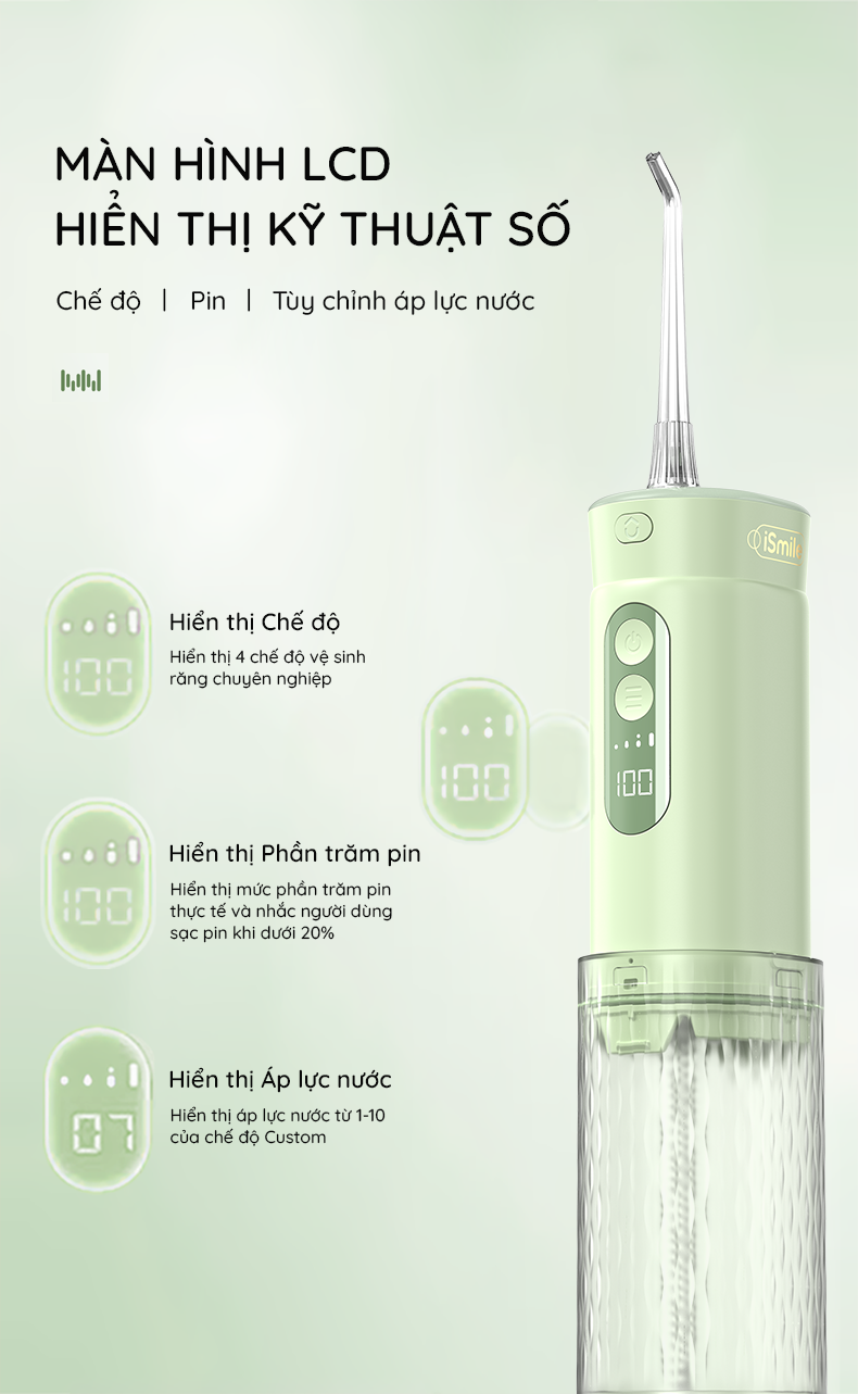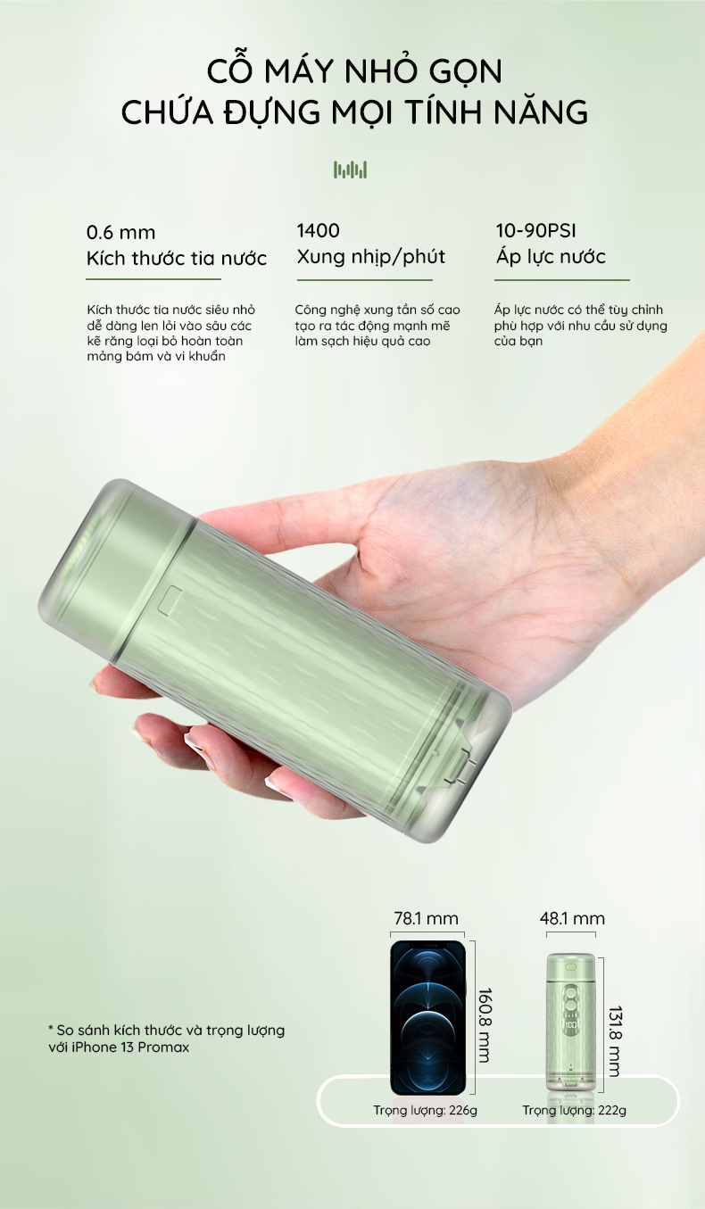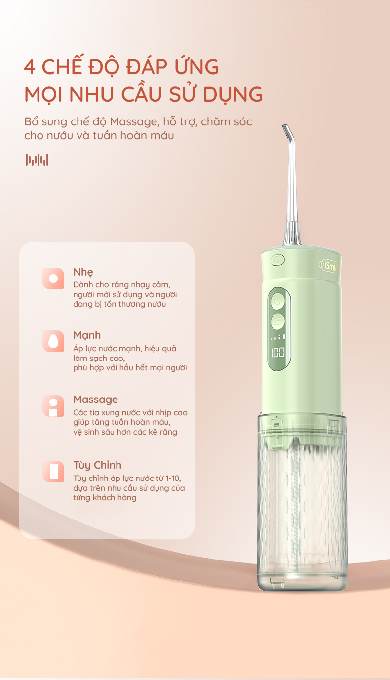 ???? 4 Chế độ làm sạch: Nổi bật với chế độ Pulse - Bấm để bắn tia nước. Chế độ Custom - Có 8 mức để lựa chọn, phù hợp với tất cả mọi người (Nhấn giữ 3 giây tại chế độ này để kích hoạt)