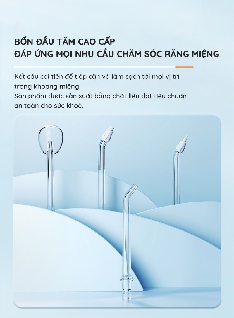 ✔ Bộ sản phẩm: 01 máy tăm nước + 04 đầu tăm nước và hộp đựng + 01 đế sạc + 01 sách HDSD