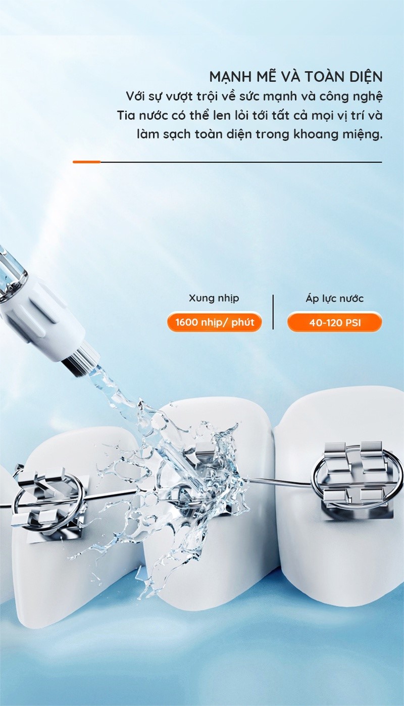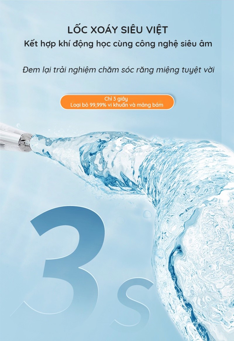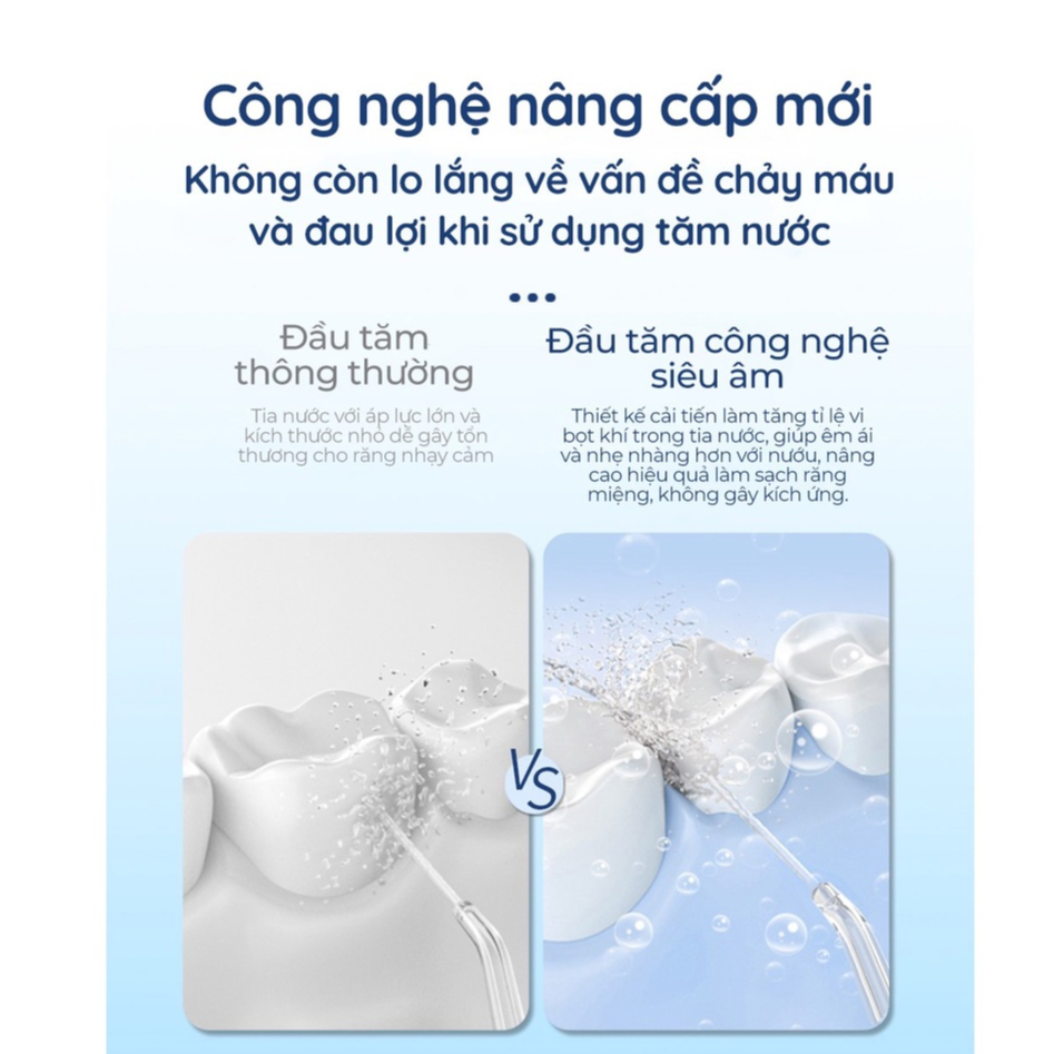 ✅ Công nghệ siêu âm: tăng tỉ lệ vi bọt khí trong tia nước giúp tia nước êm ái với răng lợi, khi nổ vỡ, các vi bọt khí sẽ tạo ra sóng xung kích giúp hiệu quả làm sạch cao hơn so với các tăm nước thông thường, loại bỏ tối đa các mảng bám li ti trên răng.
