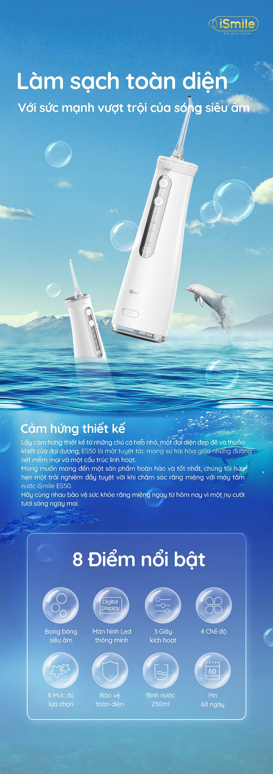 Cải thiện những nhược điểm của các dòng tăm nước cũ, tích hợp nhiều công nghệ hiện đại, đem tới một trải nghiệm mới mẻ và trọn vẹn, chúng tôi xin giới thiệu Máy tăm nước iSmile ES50.